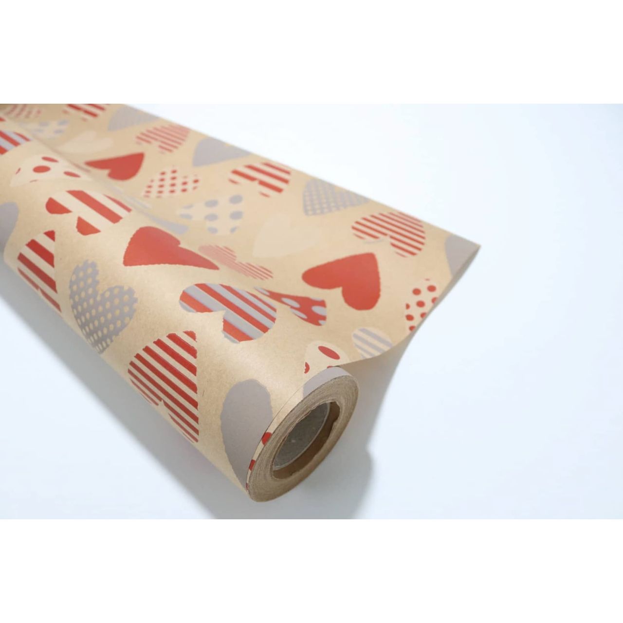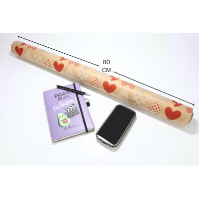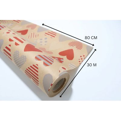 Rollo de bobina de papel Kraft con impreso de corazones rojos, imprescindible e ideal como envoltorio para todo tipo de productos. Gracias a su ancho de 80 cm, longitud de 30 metros y peso de 60 gr, garantizamos que tendrás un papel flexible y resistente.