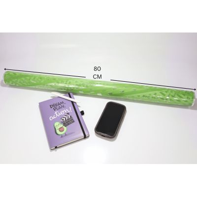 Rollo de bobina de papel transparente para envolver con impreso en color verde crema, imprescindible e ideal como envoltorio para todo tipo de productos. Gracias a su ancho de 80 cm y longitud de 50 metros, garantizamos que tendrás un papel flexible y resistente.