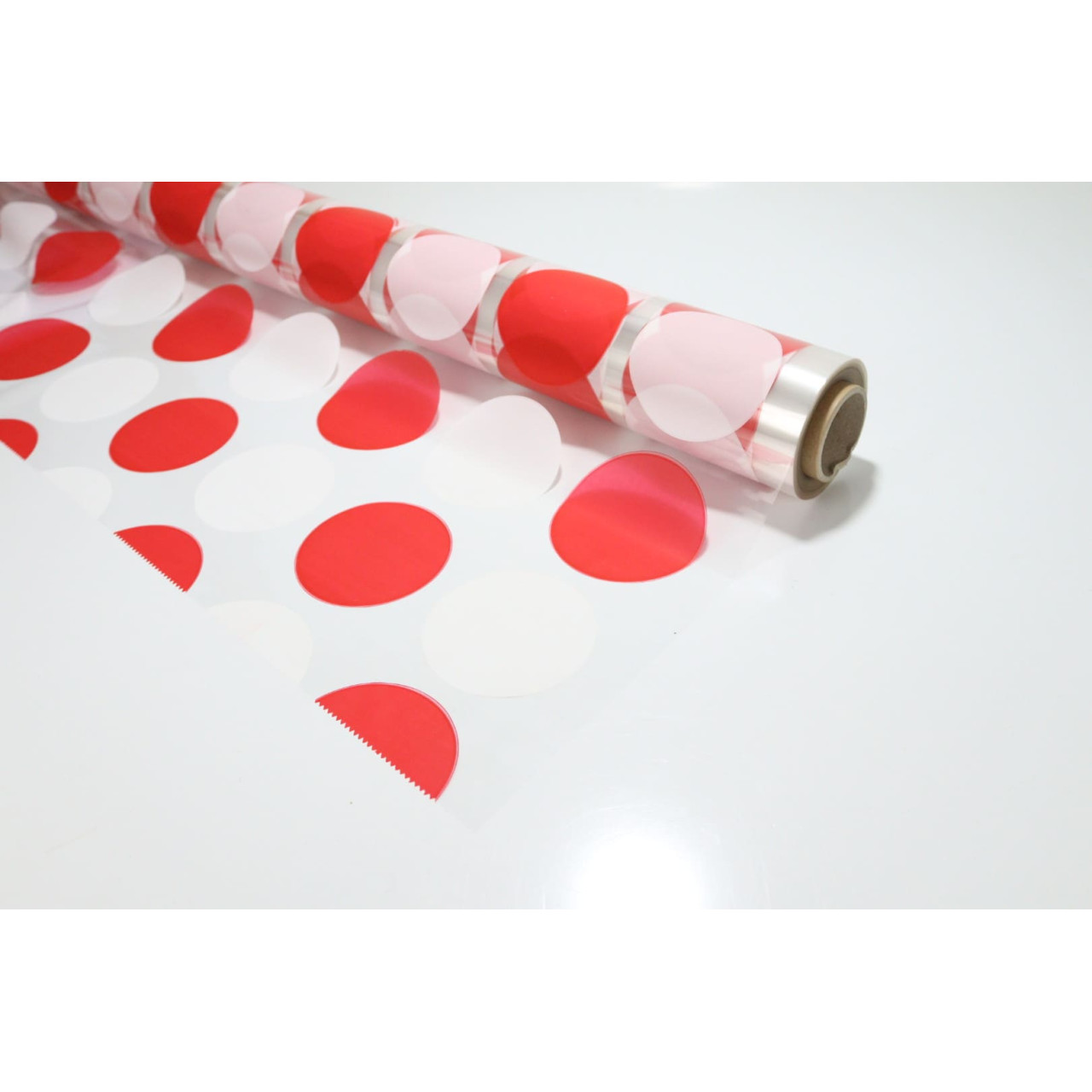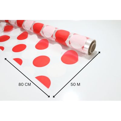 Rollo de bobina de papel transparente para envolver con impreso de topos en color blanco y rojo, imprescindible e ideal como envoltorio para todo tipo de productos. Gracias a su ancho de 80 cm y longitud de 50 metros, garantizamos que tendrás un papel flexible y resistente.