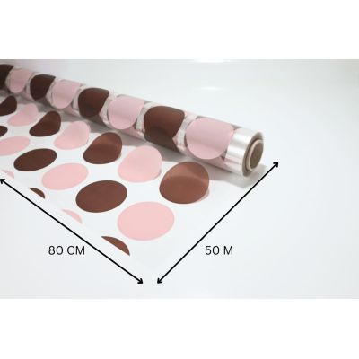 Rollo de bobina de papel transparente para envolver con impreso de topos en color lila y marrón, imprescindible e ideal como envoltorio para todo tipo de productos. Gracias a su ancho de 80 cm y longitud de 50 metros, garantizamos que tendrás un papel flexible y resistente.