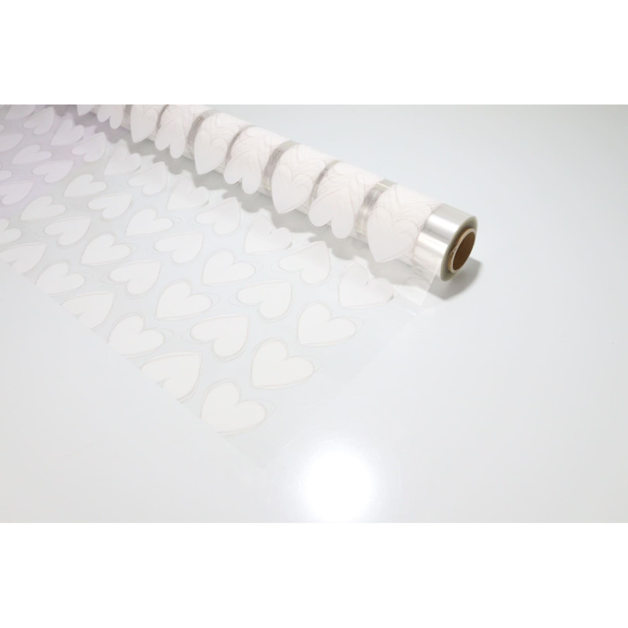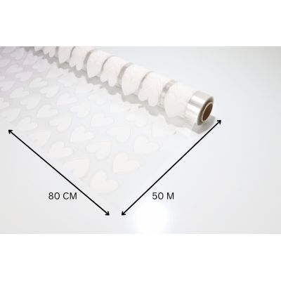 Rollo de bobina de papel transparente para envolver con impreso de corazones en color blanco, imprescindible e ideal como envoltorio para todo tipo de productos. Gracias a su ancho de 80 cm y longitud de 50 metros, garantizamos que tendrás un papel flexible y resistente.