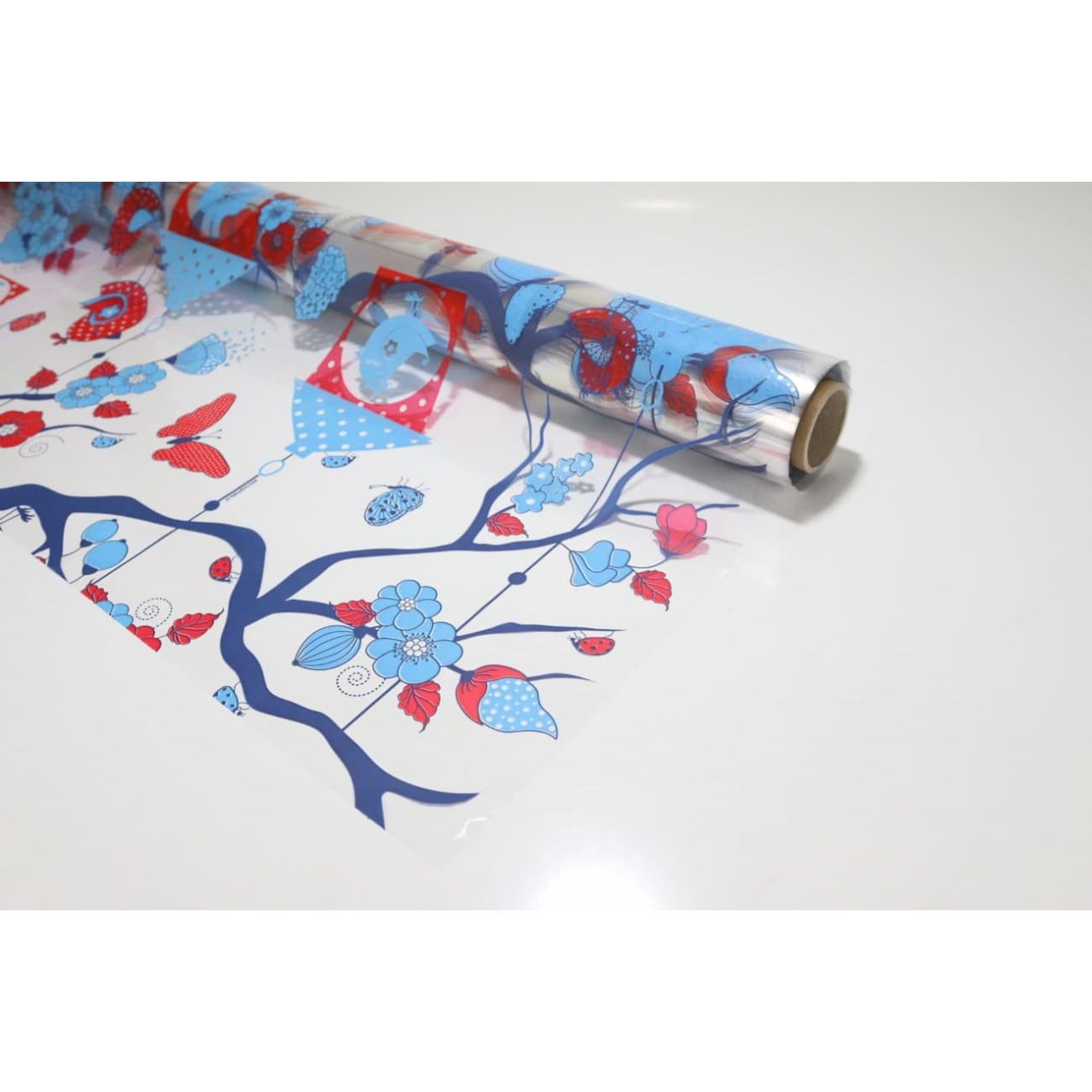 Rollo de bobina de papel transparente para envolver con impreso de pájaros en color azul y rojo, imprescindible e ideal como envoltorio para todo tipo de productos. Gracias a su ancho de 80 cm y longitud de 50 metros, garantizamos que tendrás un papel flexible y resistente.