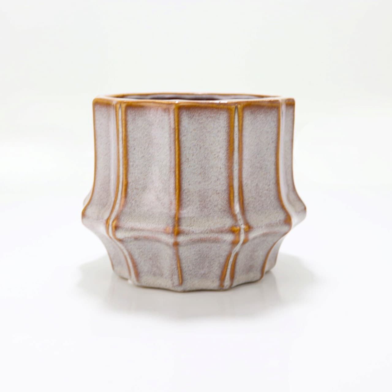 DECORATIVE CREAM/GRAY CERAMIC PLANTER POT WITH RELIEF FINISH.